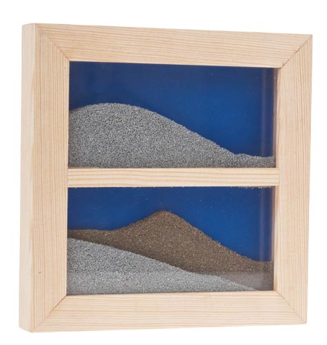 A 2 üveg között 2 részre osztott térség, különböző színű homokkal van megtöltve. A homokóra működéséhez hasonlóan kis nyílásokon szóródik le az apró szemű homok a keret alsó felébe. Mindig új és új sivatag képződik a szemünk láttára. Még érdekesebb variációkat érünk el, ha a színes homokot összekeverjük. A homok színezéséhez a Marabu dekor üveget ajánljuk. A szükséges mennyiség 100g homokhoz kb. 1 kiskanál festék. A keret mérete: 170 x 170 x 25 mm Tartozékok: speciális homok, üveglapok, fa és pontos használati útmutató.