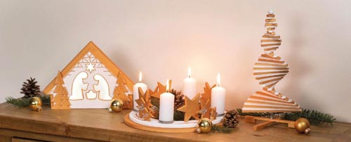 Hangulatos koszorú préselt fából, 4 db alumínium gyertyatüskével kb.ø 40 x 5 mm. Fúró és fűrészmukákhoz ideális gyakorló csomag. Szükséges munkafolyamtok: fúrás, fűrészelés, csiszolás, enyvezés, festés és összeillesztés. Leírás német nyelven.