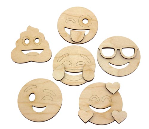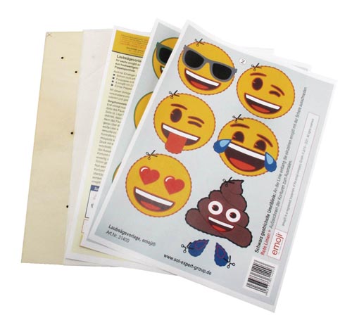 A mintákat a a transzferáló papírral kell a falemezre átrajzolni, majd a lombfűrésszel kivágni és megfesteni. Tartozékok: 1 db falemez kb. 210 x 295 mm, sablon emoji minták kb.ø 80 mm, leírás német nyelven. Szükséges munkafolyamatok: fűrészelés, csiszolás, enyvezés és festés.