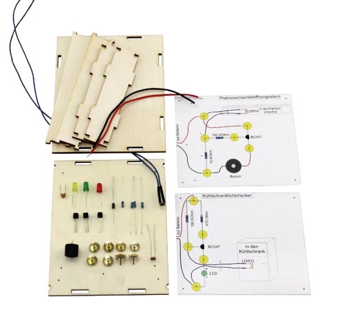 A rajzszögeket az előre stencilezett lyukakba könnyedén be lehet szúrni. A pontos leírás és jelölések alapján könnyen összeépíthető. A rajzszögek a drótok kapcsolódásához kapnak szerepet. 4 különböző, érdekes áramkör felépítése lehetséges. Pl. hűtőszekrény fényérzékelő, bombon doboz őr, vízszint ellenör. 10 éves kortól ajánlott. Praktikus fa dobozban tárolhatók az építő részek. Leírás német nyelven.