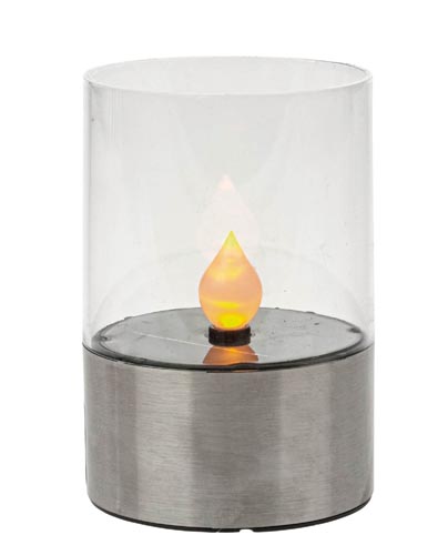 A gyertya alakú napelemes lámpa melegfehéren világít, alján egy be/ki kapcsoló található. A gyertyafény a villódzó fénynek köszönhetően valódi lángot imitál. A napelemes lámpa akkumulátora napközben napenergiával töltődik egy napelemen keresztül, a világítási idő az akkumulátor töltöttsége esetén 6-8 óra.