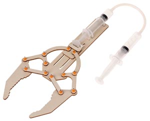 A hidraulikus vagy pneumatikus fogókar részletes modellje. A precíz lézertechnológiával vágott rétegelt lemezrészek tökéletes illeszkedést garantálnak és könnyen eltávolíthatók. A fogó folyékony vagy sűrített levegővel működtethető, így első betekintést nyújt a hidraulika vagy pneumatika világába. A szállítás eldobható fecskendőket tartalmaz. Szükséges munkafolyamat csak az összeszerelés. Kb.130 x 280 x 25 mm, 1 db