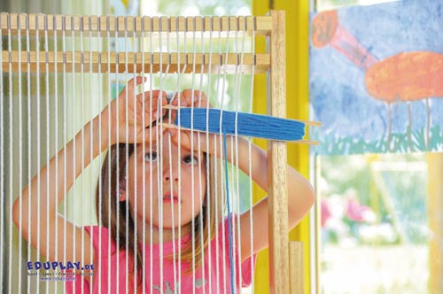 Állítható forma. A leírás alapján (német nyelven) könnyen és gyorsan összeállítható. A gyerekek nagy élvezettel használják, örömteli közös projektek eszköze. Szövési méret kb. 47 cm x 75 cm. Tartozékok: 1 db szővőkerert - 2 db vetélő - 4 gombolyag élénk színű fonal (kb. 164 g).