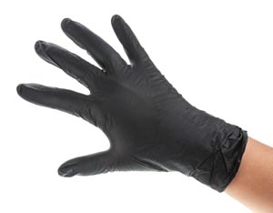 Kesztyű praktikus adagolódobozban, púdermentes, enyhén érdesített, fekete.