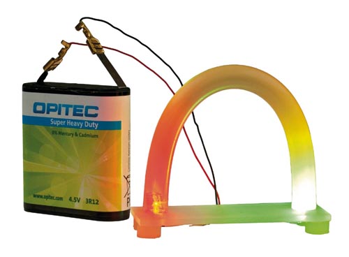 Egy kis szívárvány mindenkit elvarázsol. A világító diódák lagújabb változata teszi lehetővé, hogy, saját szívárványát építse meg, mely a lassú színváltoztatás hatására a szívárvány színeit imitálja. A boltív két végén elhelyezkedő dióda fokozatosan változtatja a három alapszínt (piros, kék, zöld). A műanyagcsőben összekeverednek a két dióda színei, melyek részben erősítik részben gyengítik egymást. Így sikerül egy színes fényjátékot előidézniük. Összeépítése nagyon egyszerű. 110 x 35 x 85 mm, 4,5 v-os elem nélkül