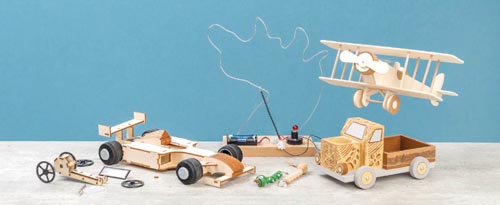 E mobolitás - zaj nélkül és környezetbarát! A részletes német nyelvű leírás alapján könnyen összeépíthető gyakorlatlan kezek számára is. A csomagban található enyvvel kell a laserrel vágott részeket összeragasztani. Extra könnyű aluminium tengelyek biztosítják a jármű laza gördülékenységét a napsütésben. Nem szükséges lótozás, csak egy kis csavarhúzóra van szükség. 2 látható fa fogaskereket kell egy elektromotorral összeépíteni, ami a járművet mozgatja.