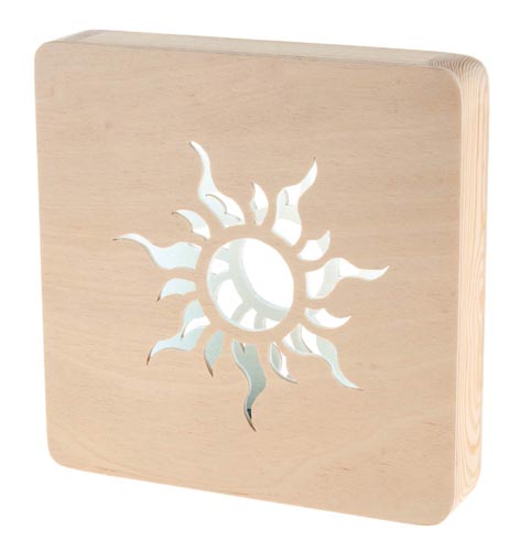 Mutatós lombfőrész munka, egyszerű áramkörrel forrasztás nélkül. Az elemetartó box ki/be kapcsolóval rendelkezik. A fényt egy öntapadós LED csík (30 izzós) biztosítja. Több féle sablonmintából lehet választani, de saját elképzelés is megvalósítható. A működéshez szükséges 2 db 1,5 (AA) elemet külön kell megrendelni. Elkészítési munkafolyamatok: bejelölés, fúrás, fűrészelés, csiszolás, enyvezés/ragasztás és összeépítés. Faanyag kb. 200 x 200 x 38 mm.