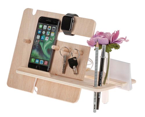Praktikus íróasztali dekoráció, egyszerű munkafolyamatokkal készíthető el. Sok mindennap használatos tárgynak ad egy állandó helyet, mint pl.mobiltelefon, karóra, jegyzetfüzet, ceruzák, olló, stb. Szükséges munkafolyamtok: bejelölés, fűrészeslés, fúrás, csiszolás, enyvezés és összeszerelés. Leírás német nyelven.