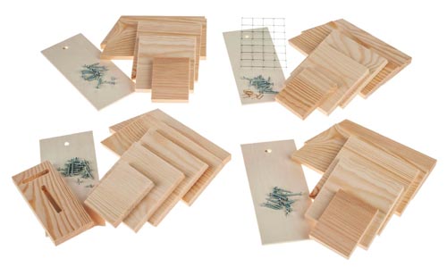 Pillangók, rovarok és molylepkék számára. Kezeletlen masszív puha natúr fából, 2 házikó kellékek nélkül, 1 házikó pillangó és molylepkéknek és 1 házikó ráccsal. Szükséges munkafolyamatok: bejelölés, enyvezés és összeépítés. Leírás német nyelven.