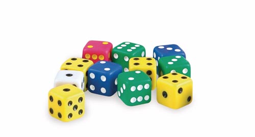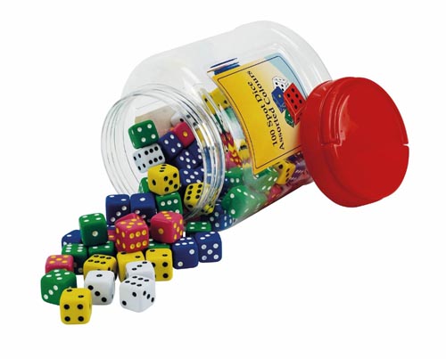 készlet 100 db hatoldalú, lekerekített sarkú/élű kockát tartalmaz, kiváló minőségű műanyagból. A kockák piros, zöld, kék, sárga és fehér színben vannak rendezve. A szemek fekete vagy fehérek. Alkalmas játékokhoz vagy tanulási feladatokhoz. Praktikus tárolódobozban szállítjuk.