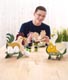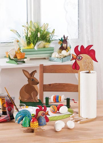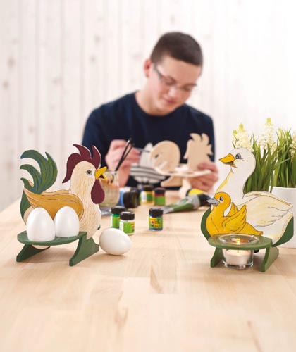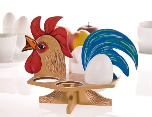 A tojástartó vidám hangulatot varázsol az asztalra és egy ötletes ajándék az anyukáknak. A leírás és a papírsablonok segítségével (1:1 arányban) könnyen felrajzolhatjuk a körvonalakat a furnérlemezre. A felrajzolt mintákat egy lombfűrésszel tudjuk kivágni, majd befesteni. 180 x 145 x 155 mm