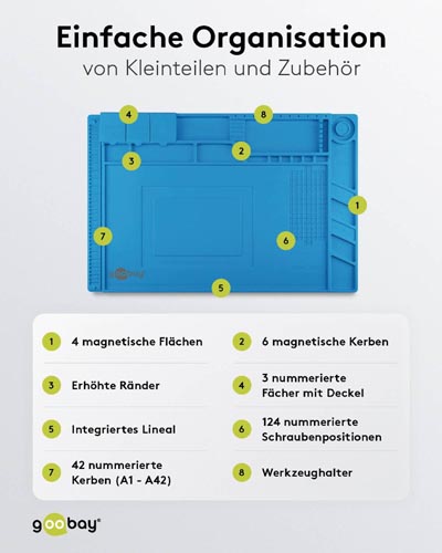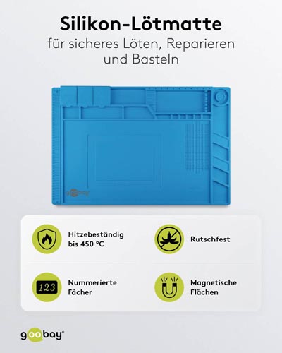 Rugalmas, antisztatikus szilikon szőnyeg áramköri lapok forrasztási, javítási és kézműves munkákhoz. A munkafelület 450°C-ig hőálló, mágneses rekeszekkel és beépített vonalzóval rendelkezik a precíz munkavégzés érdekében.