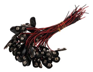 Csatlakozás 9 V-os blokkhoz vagy elemtartóhoz, 150 mm-es csatlakozó vezetékekkel.