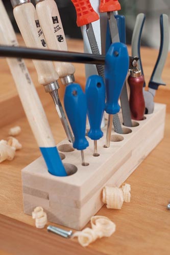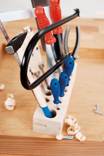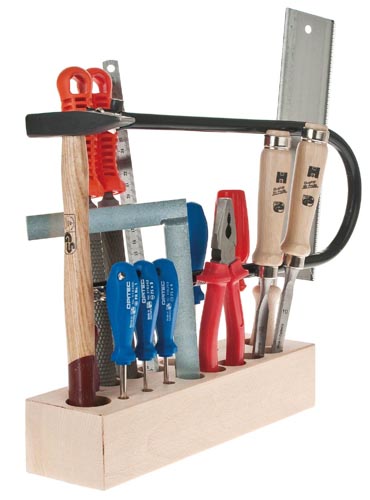 lombfűrész 250 mm, 2 db (3 x 75 mm és 4 x 75 mm) egyenes csavarhúzó, 2 db csillag csavarhúzó (1 és 2 méret), 2 db félgömbölyű reszelő (finomabb és durvább), kombinált fogó 160 mm, acél mérőlap 300 mm, lyukasztó (kerek), derékszög 200 x 130 mm, kalapács 200 g, 2 db favályó szerszám