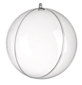 Két összeilleszthető részből álló, átlátszó acryl gömb, akasztóval. 15 mm lyukkal égősor izzóknak.