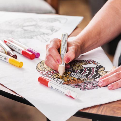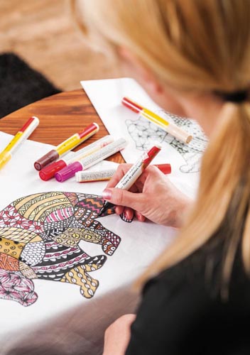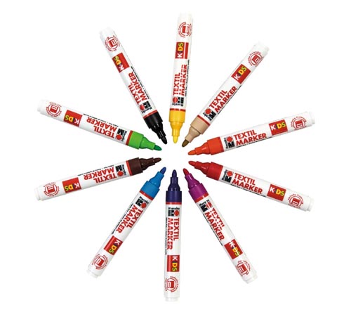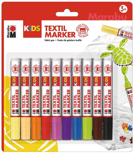 10 db (sárga, viola, pink, barna, narancs, testszín, fekete, zöld, kék és piros), hegy kb.3 mm vastag, öblítő használata nélkül mosott, 20 %-nál nem nagyobb műszáltartalmú táskák, pólók, stb festésére alkalmas. 60°C-ig mosható.