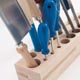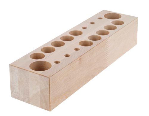 Különöző szerszámok tárolására használatos bükkfa box, szerszám nélkül, 6 lyuk ø10 mm, 10 lyuk ø25 mm, 2 lyuk ø35 mm,