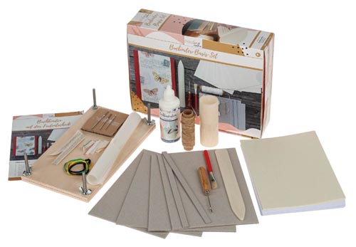 A csomag tartalmából egy saját könyv készíthető. Tartozékok: 4 db könyvbekötŐ papír kb. 216 x 151 mm - 2 db könyvhát lap kb. 10 mm széles - 2 db szilikon elválasztólap kb. 190 x 210 mm - 4 db elő és hátlap A4 forma - 50 db hosszába hajtogatott papír 80g/m², 1 db hajtásvonal készítő szerszám - 2 db könyvkötő lap kb. 100 x 250 mm - 3 különböző könyvkötő tű - 30 m viaszolt könyvkötő madzag - db füzetkötő szalag kb. 10 x 80 mm - 3 db könyvjelző szalag kb. 4,5 x 250 mm - 100 ml könykötő enyv -1 db enyvező ecset - 1 db csavaros könyvprés kb.260 x 145 mm - leírás német nyelven.