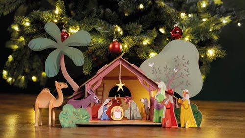Erős kartonból összeállítható dekoráció. Tartozékok: 10 db karton figura kb.128 mm magas - 1 db jászol istálló - leírás német nyelven.
