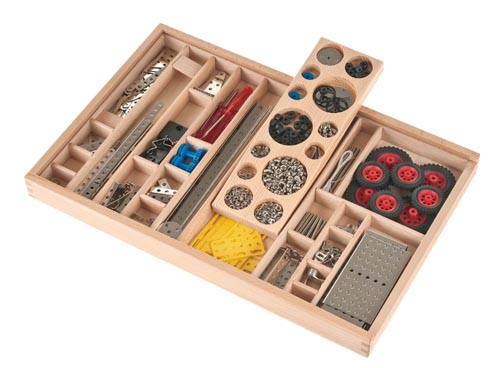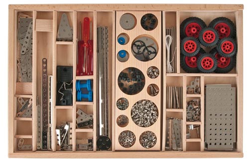 A 432 db részelemet és a szerszámokat ebben a tolótetős fadobozban tárolhatjuk. A csomagból két diák dolgozhat egyszerre, a csoportos munka egy fontos köve az iskolai tevékenységeknek. A szereléshez a német nyelvű leírásban kapnak ötletet a gyerekek.