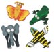 Egyszerü lombfürészmunka, kiegészítve egy ruhacsipesszel, ami a csípö mechanizmust szolgálja. Krokodil hossza 85 x 35 x 110 mm, elefánt 80 x 35 x 100 mm, repülő 130 x 35 x 110 mm, pillangó 105 x 35 x 85 mm