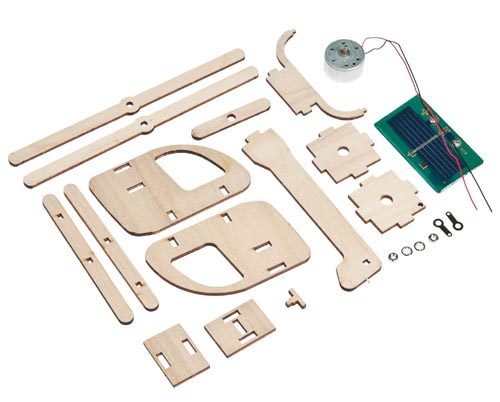 Előre stencilezett préselt nyírfalapból kell összeállítan. Nem kel ragasztani és csiszolást sem igényel. Már kevés napsugár hatására is forognak a propellerek. Szolárcella: 0,5 V - 250 mA és szolármotor RF 300 Propeller 155 mm össz kb. 200 mm