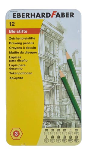 Törésálló betét, könnyen hegyezhető és radírozható, fém dobozban, 12 keménység