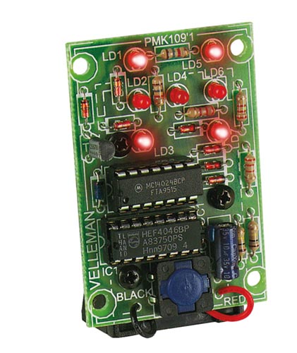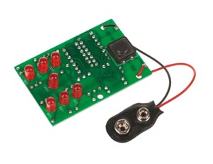 A piros billentyű lenyomása után az IC kikeres egy számot 1 és 6 között, melyet a 7 db piros 5 mm LED izzó jelez. 10 éves kortól ajánlott kezdők vagy haladók számára. A működéshez szükséges 9V elemet külön kell beszerezni. Leírás német nyelven.