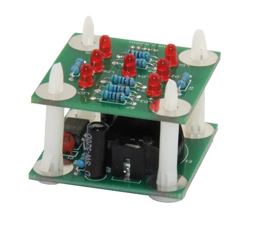 Kezdőknek kiváló feladat. A csomagban található egy dióda és ellenálás hajlítására alkalmas szerszám. A részletes leírást követve könnyen összeépíthető jelző szerkezet. Ha rázkódik a kocka, akkor a diódák a végén 1 - 6 közötti számban a villogást követően égve masradnak. 1 db 3V (CR2032) gombelemmel működik, amit a csomag nem tartalmaz. Szükséges munkafolyamatok: forrasztás (lótozás) és összeépítés. Leírás német nyelven.