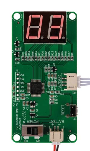 Csatlakoztatásra kész, 2 számjegyű számlálómodul LED 7 szegmenses kijelzővel maximum 99-ig. A következő jelváltáskor (99 + 1) a kijelzőn '00' látható. A számlálómodult egy U alakú fénysorompó indítja el. Áramköri modul, amely tartalmazza a tápellátás be-/kikapcsolóját, reset gombot, elemtartót 3 db LR06 elem (AA). Nincs szükség forrasztási munkára. Az elemeket nem tartalmazza. 1 szett
