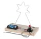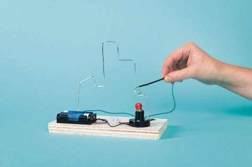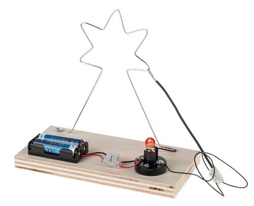 A drót megérintésénél felgyullad egy piroas fény. Egyszerű áramkör. Lótozást nem igényel. A működéshez szükséges 2 db 1,5V (AA) elemet külön kell beszerezni. Szükséges munkafolyamatok: hajlítás és összeépítés.