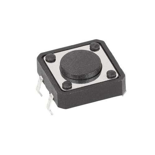 Egypólusú bemeneti gomb nyitóérintkezővel (benyomható) 4 érintkezős, PCB rögzítéshez (bepattintható) max. 50 mA 12V DC, ház méretei: 12 x 12 mm Gomb magassága: 4,3 mm, tűosztás: 5 x 12,5. mm, adat- és jelzéstechnikához, mérés- és vezérléstechnikához és membrán billentyűzetekhez, élettartam 100 000 kapcsolási ciklus felett.