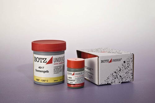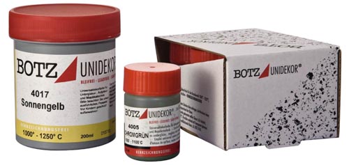 Tartozékok: fehér, sárga, piros, kék, chrómzöld és fekete, égetés elött matt és halványabb árnyalata van.Égetés után kapják meg a szín teljességét. A színek egymással keverhetők és szükség esetén vízzel keverhetők.
