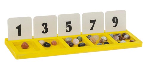 A számoló lap a számok megismerésének segédeszköze. A kártyán feltüntetett számnak megfelelő mennyiségű pl.golyót, kell a méllyedésbe helyezni. Méretek: 120 x 500 x 19 mm vastag, 5 méllyedés mérete 80 x 90 x 15 mm, méllyített kártyalap tartó csík 500 x 4 x 13 mm, natúr