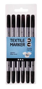 6 db fekete, dupla hegyű filctoll, világos textiliák festésére, melyek 20 % alatti műszál tartalommal rendelkeznek. A festés elött az anyagot öblítő használata nélkül kell kimosni. Vízes bázisú festék, 40 °C-ig mosható, hegyek vastagsága kb. 2,3/3,6 mm