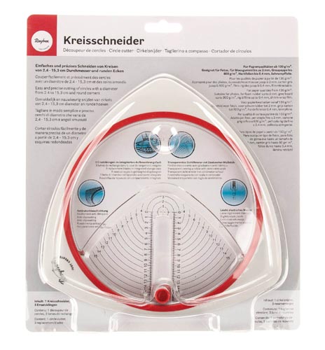 Kb. ø 24 - 153 mm nagyságú korongok, körök precíz vágására valamint sarkok lekerekítésére alkalmas szerszám. Átlátszó cm beosztású kis ablakkal, csúszásgátlós nyéllel. Dekorgumihoz, 130 g/m² -nél vastagabb papírhoz, 600 g/m² - ig erős szürke kartonhoz és kemény fóliához 0.4 mm vastagságig alkalmazható. 3 db tartalék pengével.
