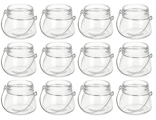 Üveg mécsestartó, akasztó fogantyúval, kb. ø 65 x 75 mm átlátszó, 12 db