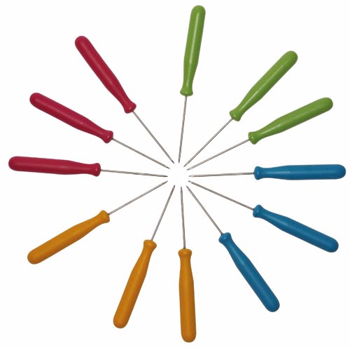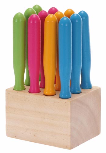 12 db lyukasztó toll 4 különböző színben, fa nyéllel, tű hossza kb.43 mm, össz.135 mm, fatömb kb.85 x 65 x 55 mm