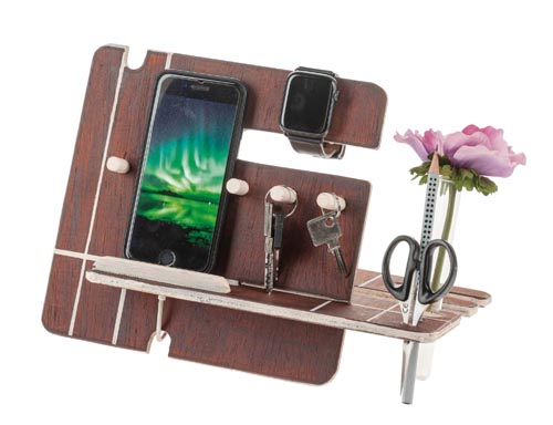 Praktikus íróasztali dekoráció, egyszerű munkafolyamatokkal készíthető el. Sok mindennap használatos tárgynak ad egy állandó helyet, mint pl.mobiltelefon, karóra, jegyzetfüzet, ceruzák, olló, stb. Szükséges munkafolyamtok: bejelölés, fűrészeslés, fúrás, csiszolás, enyvezés és összeszerelés. Leírás német nyelven.