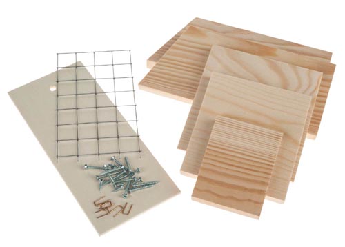 Rácsos, tobozzal, fakéreggel, fa rostszálakkal és más natúr anyagokkal tölthető meg. Kezeletlen masszív puha natúr fából. Szükséges munkafolyamatok: bejelölés, enyvezés és összeépítés. Leírás német nyelven.