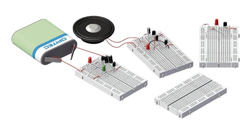 3 elektronika breadboard program, lótozás nélküli. Egyszerűen összeilleszthető elemekből, könnyen le és felépíthetők. A 4,5 V lapos elem nincs a csomagban. Leírás német nyelven.