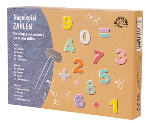Tartalma: 1 db parafatábla, 1 db kalapács, 80 db szög, 47 db különböző színű fa forma