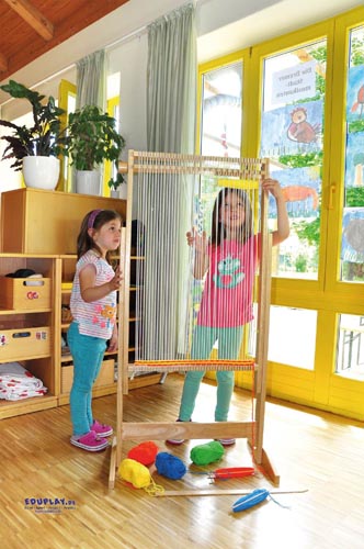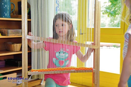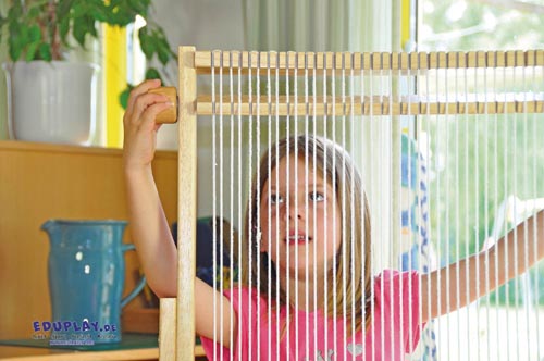Állítható forma. A leírás alapján (német nyelven) könnyen és gyorsan összeállítható. A gyerekek nagy élvezettel használják, örömteli közös projektek eszköze. Szövési méret kb. 47 cm x 75 cm. Tartozékok: 1 db szővőkerert - 2 db vetélő - 4 gombolyag élénk színű fonal (kb. 164 g).