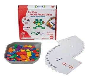 Fejleszti a kreatív gondolkodást, a finommotorikát és a minta utáni kirakás közben a gyerekek játékosan ismerkednek a számolással is. Tartozékok: 1 db szürke tálca kb.250 x 250 x 25 mm, 44 db színes chips kb. ø 20 - 30 mm, 25 db mintarakó kártya. Leírás német nyelven. 3 éves kortól ajánlott.