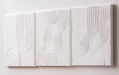 Minimalista vászonkeret képek fehérben. Elkészítésükhöz struktúrpasztára és különböző mintákat húzó spaklira van csak szükség. Tartozékok: 3 db feszített vászonkeret kb.30 x 30 cm, 250 ml fehér struktúrpaszta, 4 db mintahúzó spakli.